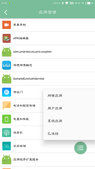 6、应用管理:查看本机所有应用程序,包括外部安装和系统自带应用,可卸载、冻结/解冻、清楚数据;