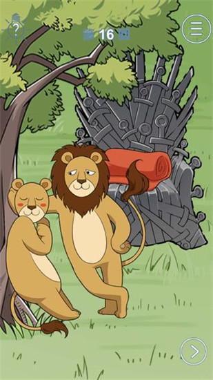 (爬梯子/直接入座/用四叶草吹树冠,拿王冠戴在右边的狮子头上,等着)
