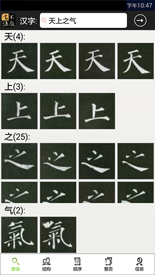 7、在单字大图界面下,不厌书法app提供大图内两指开合放大缩小单字图;单字图内单指左右滑动,可切换前后字图;