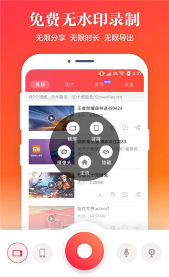 横屏、竖屏任意切换,同时可开启/隐藏悬浮窗录屏模式,可以摇一摇唤出悬浮窗控制录屏工具