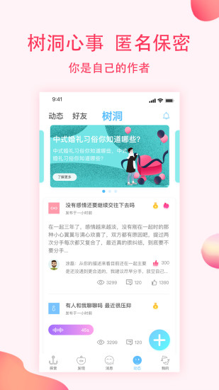 [倾听]特别设定匿名树洞功能,可以随时随地把无处诉说,又不想藏匿的内心话吐露出来。这里没有杠精,没有身份,没有人设,没有人指指点点,有的是能够还你一片心灵的净土。
