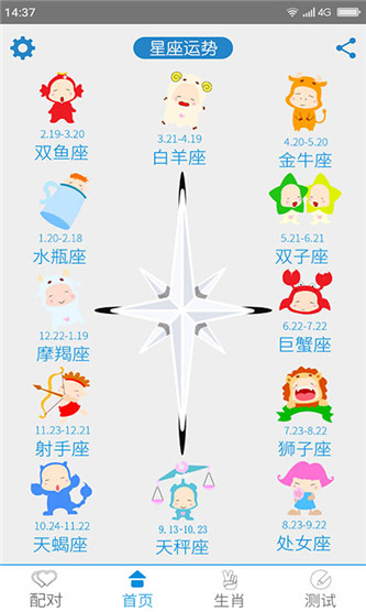 十二星座运势配对app包括综合运势,爱情运势,事业运势,财富运势以及健康运势