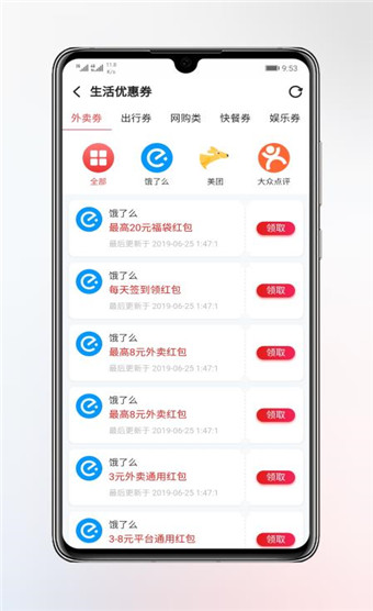 六、生活优惠券功能,大量的出行、网购、快餐、娱乐劵可以任你领取