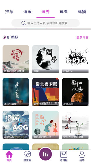 逗秀:可以收听音频节目和视频节目,对喜爱的节目进行订阅和评述。