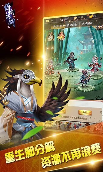 倚剑江湖官方版中战斗是很具有特点的,它以即时战斗的方式进行。进入战场后,双方英雄会自动战斗,双方英雄都是先攻击前排敌方,所以在前排可放防御型的英雄,以保护后方治疗与辅助的英雄噢~尽量上阵有侠缘的英雄,这样整队属性能大幅提高。英雄头上有两条框,红色的是血条,黄色的是怒气。英雄每次受击或击杀敌方都会获得怒气,当怒气满后会出现技能图标当玩家点击怒气图标时,英雄则会释放大招,攻击敌方。巧妙搭配好英雄,并即时释放怒气技能,是胜利的不二法则噢~