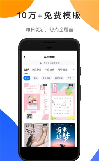 创客贴设计手机版是一款涵盖了多种图片视频编辑处理功能的手机图片视频编制制作软件,该软件拥有丰富的模板可供用户使用,简单的操作,让用户能够轻松制作出一个非常不错的图片视频出来,另外还支持多终端协作,能够在多个不同的平台一起进行操作。海量精美的模板覆盖了公众号封面首图、手机海报、PPT、张贴海报、简历、名片、邀请函等多种内容的设置,足以满足用户的基本需求,并且操作也不难,用户在这里只需通过简单的文本修改和图像替换就可以设计出美图。除了能够为用户提供各种类型的素材模板之外,还为用户提供各种详尽的操作,可以对正在编辑的模板进行更加详细的编辑,更改字体颜色,添加特效,裁剪等等,只为让用户获得更加精美的作品。不管是在新媒体运营、活动设计、