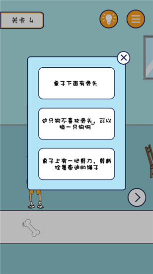 剪刀剪短泰迪的绳子,从桌子下得到骨头,打开窗,给哈士奇,点击漫画书