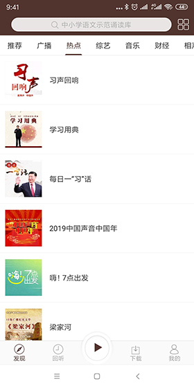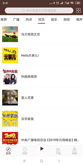 听歌、热点新闻、故事的收听,并且支持广播的回听,另外支持下载与定时关闭。同样界面十分的简洁。客户端是中央人民广播电台重点打造的一款综合音频类产品,为用户提供电台直播、直播回听、音频点播、离线收听等全方位收听服务。客户端覆盖3G/4G、WIFI网络环境,并与中国广播官网、苹果Podcast平台保持节目内容统一同步更新,汇集了中央电台、地方台、版权公司、互联网热门播客等单位提供的音乐、娱乐、财经、汽车、相声、脱口秀等分类的数万条碎片化精品版权音频节目,拥有全国350套直播频率,由专业编辑团队每日不断更新最流行的音频节目,为用户持续提供丰富多彩的音频节目欣赏服务,并具有用户互动、收藏评论、订阅分享、离线回听、预约收听、特色闹钟、定时关闭等实用功能。