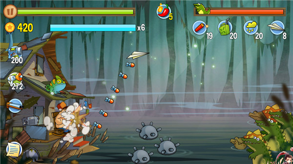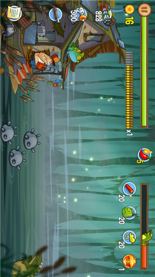 植物大战僵尸和塔防中的玩法元素,拥有单人剧情和多人对战两种模式,单人模式下共有8个章节,每个章节又包含数十种小关卡,也有UFO这样的特殊关卡存在,在每一关中都会有成群的沼泽怪物要围攻小木屋,你的任务就是利用手中的武器,保护木屋不被破坏。另外,除了用金钱升级武器提高战力外,还提供各种的有趣的随机道具来助你快速消灭怪物。