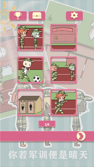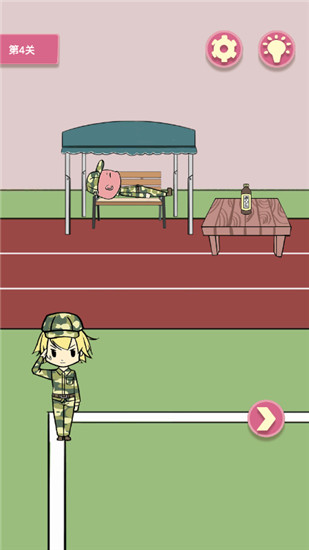 军训大作战正版是一款趣味十足的休闲益智类游戏,临近开学,每次开学对于一些新生来说都是苦闷的一段日子,因为要面临着军训这个残酷的体验,每天要在太阳底下晒几个小时,从一个白白净净的孩子,变成一个黑不溜秋的李逵。作为玩家的你,你将要扮演一个刚开学不久就要军训的学生,而你所要做的就是想尽一切办法帮助主角在军训过程中躲过辛苦的项目,完成偷懒。游戏画风魔性简单,玩家很容易被抓住眼球。游戏过关方法与众不同,道具和机关经常藏在意想不到的地方,玩家必须绞尽脑汁分析剧情的提示信息,达成通关,当然也可以乱点一气,说不定会发挥奇效。