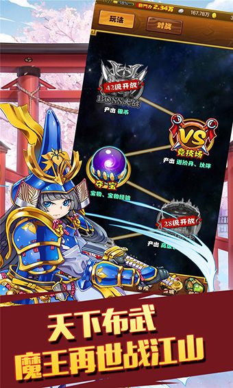 卡牌手游,战国题材在国内的手游算比较小众,采用Q版的丰富,角色非常的Q萌在人物建模设计上非常的精美,每个角色都有着独特的形象,战国时代背景当然各国的战乱纷争,玩家需要开启指挥,招募各路战国英雄,招募强力的兵马,各路英雄作为将领,玩家指挥军队作战,战场厮杀,笑战群雄,排兵布阵,结合游戏的玩法,运用策略来打败敌国,统一天下本游戏,告别传统手游的无脑模式,需要玩家开动智慧,结合游戏内的各种玩法制霸战国,此外太阁立志2的人物都是风云变幻的战国时代众多的英雄人物,使玩家能够在历史的沧桑分合中,感受小人物的坎坷经历。快来下载体验吧!