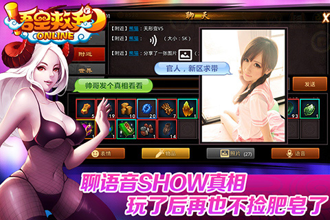 4、物品、表情:此外游戏中还提供物品展示,表情发送功能。打到极品道具免费实时和大家分享。表情让你在游戏中更能生动表达自己。
