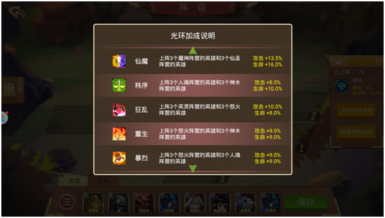 双色光环:同理,仙魔这个光环也是双色光环里面最强的,+13.5%攻击和+16%血量能够让玩家在同等配置的队伍中领先一筹,但是同样的仙魔英雄相对难以获得。在游戏中期,建议大家还是选择两个阵营的T1英雄进行培养构筑双色光环。