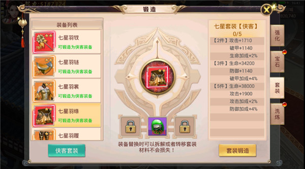 焚天决每种套装又分为侠客与宗师两种,套装必须先打造侠客套装,才能打造宗师套装。打造套装每个部位都需要套装石,攒齐套装石才可以打造该部位。