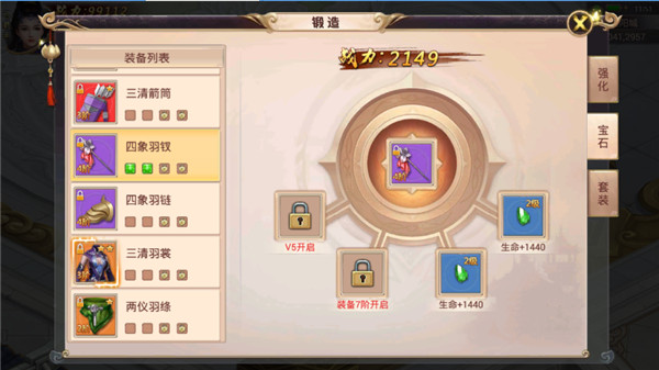 每件装备有两个属性孔,可以镶嵌宝石,7阶以上装备有3个孔,VIP玩家还可以开启第4个装备孔。宝石分为生命宝石与攻击宝石两种,可以对宝石进行升级,宝石等级越高所附加的属性越多。