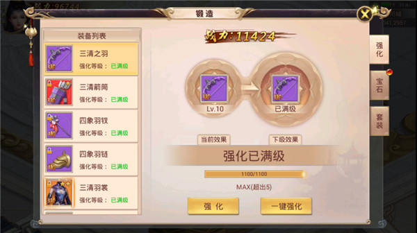 装备可以进行强化,强化可增加装备大量的属性。装备有阶数之分,每个阶数的装备强化等级上限都不一样,越高阶的装备强化等级上限越高。