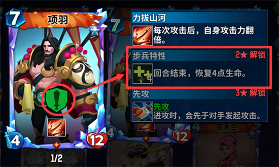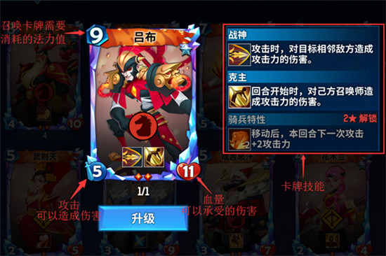 战斗牌是获得战斗的基础,棋手通过消耗对应法力召唤战斗牌的英雄进入战斗区,每张战斗牌都有伤害和血量两个属性,提升战斗卡的等级可以获得属性的提升,同时解锁对应等级