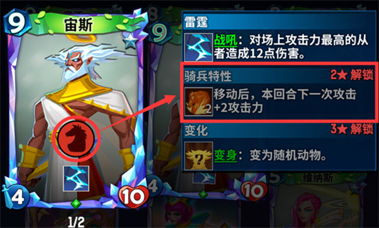 战斗牌中通常作为冲锋的角色存在,特点是血量和攻击都较为平均,和步兵一样只能攻击最近卡点的单位,但在每回合中能移动2个卡点的位置,快速的移动往往用来抢占资源和有力位置有奇效;骑兵牌的通用特性是在每次移动后会增加自身的攻击力。