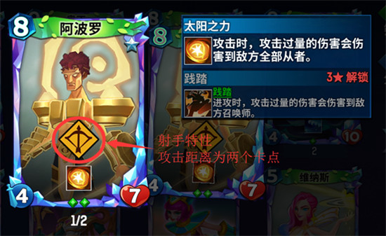 射手牌中通常作为输出的角色存在,特点是攻击较高,但是血量较少;射手牌在每回合中也只能移动一个卡点的位置,但是由于射手特性的原因,射手的攻击范围可以覆盖到两个卡点,在攻击骑兵和步兵时,这两个卡牌就无法对射手进行反击。