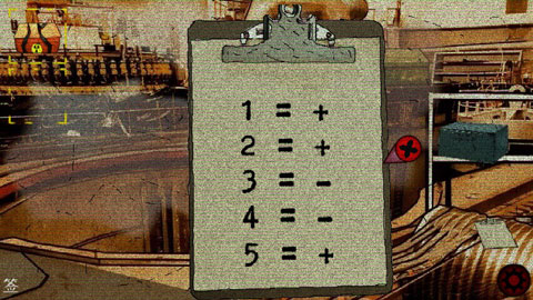 4、这时你会发现中间场景的墙上的密码,+为蓝色,-为红色,依次点亮为:蓝蓝红红蓝,然后点右下方即可打开。