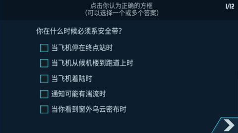 首先进入游戏后会有12道题目给你选择,这里有多选题也有单选题,主要就是测试一下你对飞机中遇到的一些事项能够做出正确的判断,当然前期肯定很多朋友都显现出很多不足,但当你完成了这些挑战后再回去做题目你会觉得很充实。