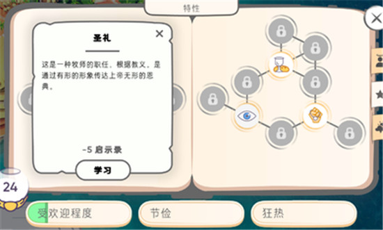 2、解锁更多的道具来扩建宗教的规模,招纳有缘人来帮助你管理以及运营;