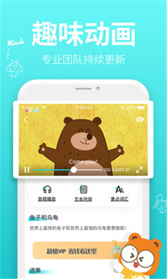小伶英语安卓版是一款专业儿童英语学习,面向5到12岁的少儿英语APP。英语在现在生活中的地位越来越高了,说好英语也能成为自己的一项技能之一。从小开始培养孩子的英语能力,小伶帮你轻松过关。这里可以看见小伶玩具的最新消息,还能看见小伶玩具演员的最新动态。小伶通过各种互动、动画、舞蹈等教学形式帮助孩子喜欢上英语,觉得不再是枯燥无味。小伶英语有着智能AR技术的支持,为孩子提供专业的教学指导。爸爸妈妈也可以参与进来和孩子互动一起学习英语,帮助孩子强化学习,提高学习效率。软件主要提供动画视频,随着章节一节一节的提升,难度系数也会相应的增加,每章节看完之后都会有习题或者小游戏让孩子巩固知识。看久了视频会使眼睛疲劳,贴心小伶为您上线,我们还有专属音频动画视频,给孩子带来全新的听觉体验效果。小伶还在里面藏了很多惊喜哟,快点下载来发掘宝藏吧。