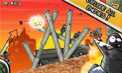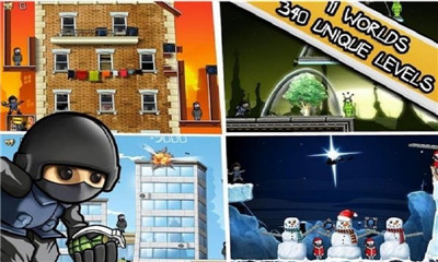 愤怒的小鸟大家应该知道吧,其玩法可能就和它差不多。游戏画面精美细腻,还有各种炫酷的特效。游戏操作也十分的简单,只需要拖动屏幕上的箭头对准目标就可以了。在游戏中玩家将扮演武装特警用手里的手榴弹去消灭那些恐怖分子。这个时候就是考验你的瞄准能力和射击能力了,投掷的位置越是精准,争取使用最少的手榴弹消灭更多的敌人。当炸死所有的敌人之后,就能够解锁3种不同的游戏世界,还拥有12个大类型主题,在其下还有40多个小关卡,让玩家在其中能够一直享受其不同的乐趣。当然,玩家还是有等级设置的,共有220个等级。游戏中还有众多不同的武器装备,玩家可以通过在关卡中获得的金币去购买更加厉害的武器,喜欢的玩家欢迎下载哦!