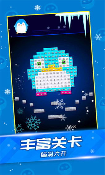 3、游戏乐趣:小球和砖块的碰撞反弹动感十足,只需要一个手指即可体验全部内容,游戏界面超华丽,视觉特效超酷炫,游戏音乐超带感!