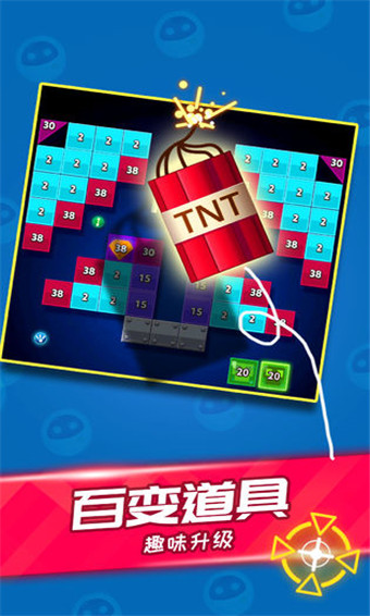 1、游戏玩法:按住屏幕,选择瞄准路线,计算反弹路线,放手发射弹球,力求让圆球在方块之间尽可能多的反弹,尽快的消除掉屏幕中出现的方块。