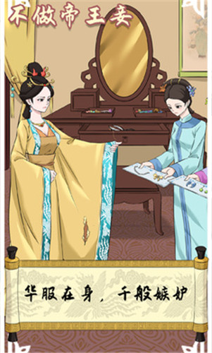 一人之下的皇后娘娘。其中的惊险狡诈可谓是多如牛毛,稍微一不小心就在里面死无葬身之地了。为玩家真实还原了里面的种种,让玩家能够亲身体验一下里面的各种阴谋诡计,以及看看以自己的智商是否能够在里面活下去。游戏的主要玩法其实很简单,就是系统会根据剧情来为玩家展示一些剧本章节,同时在展示剧情的时候会带来一些选择,玩家朋友要根据自己的想法进行选择,选择的时候记得一定要注意了,因为这些选择都会对你后面的经历产生重大的影响。不做帝王妾游戏内还有换装系统,你可以根据自己的喜好来选择今天要穿的衣服,但是穿什么衣服也是有所讲究的,这一点就得让玩家你自己去游戏里面思考哦,相信对于看过这么多宫斗剧的你来说应该不是难事吧,快来下载试试吧,看看你能爬到什么位置。