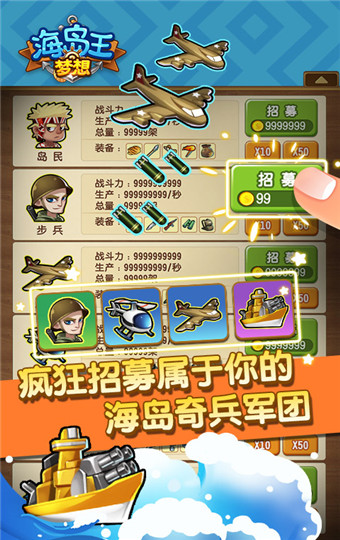 策略等三大元素完美的相结合,让你能够体会到不一样的游戏乐趣。游戏一开始,玩家将要扮演一个小岛的主人,通过自己的智慧,很好的经营它,不断的壮大自己的势力,在这个海岛上称霸。玩家需要利用自己海岛上生产的金币解锁各种兵种,或者是招募更强大的部队,然后去探索神秘的未知海域,并把海上被海岛霸占的岛屿夺回,成为最后的海岛之王。拥有丰富的道具,发挥你的智慧,更好的利用这些道具来壮大自己的势力。梦想海岛王游戏玩法非常的丰富,高度自由的玩法,玩家之间可以互相攻打,也可以结交一起攻打他人的岛屿,掠夺其他玩家的资源。还有充满策略性竞争激烈的跨服战在等你挑战!