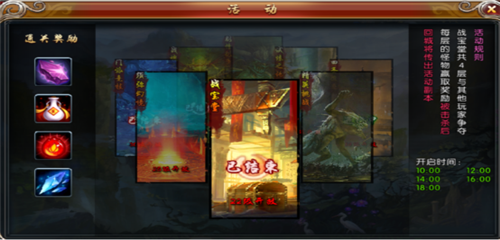战宝堂一共分为4层,每一层都有守关BOSS,击杀BOSS可以出现入口进入下一层;BOSS奖励丰厚。