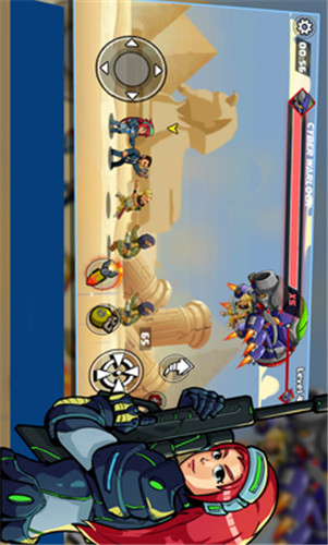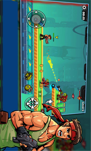 使用垫来回移动并点击以跳跃和射击。使用特殊的枪支和角色技能来击败外星人部队