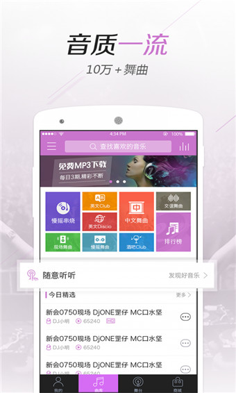 1、海量舞曲库:舞曲超过10万首,所有舞曲均经过专业音乐人审核!