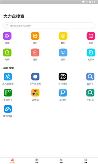 大力盘app,就是一款非常实用的网盘搜索工具,有了它您就仿佛拥有一片新大陆,不管是电影、小说、音乐、游戏还是漫画,统统都可以轻松找到。用户只需在搜索栏内输入关键字即可快速查找,分分钟找到需要的内容,用户可以点击下载,没有任何的速度限制,所有资源飞速搞定。而且大力盘app的内存空间十分巨大,很多重要的资源都可以存储在此,不用担心丢失,隐私性也很好,值得用户信赖。并且平台也没有任何的钓鱼广告,绿色无毒,感兴趣的小伙伴可以下载看看哦,得到就是赚到!