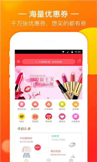 网淘省钱购给大家回回血,软件中有着各种福利券等你来领取哦!很多男同胞都想在双十一这天将自己女朋友或者老婆的密码输错三次,让她剁不了手,这也可见女人对于购物的执着,确是,网上都是便宜于实体店的好物,而且不用出门即可买到天下好物。小编也在此为大家安利这款网淘省钱购安卓版,虽然知名度不及某宝,但是其中的福利还真是不少呢!首先就是新人免单了,只要是第一次使用的小伙伴都能来选择一件商品包邮到家,还有着超多优惠卷等你来领取、限时折扣、商品返利、拼团享折扣等,买到就是赚到,类型也是众多,从衣帽鞋饰到日用百货再到家居电子等全都有,大家可以在其中愉快的剁手,再也不用但心说是败家娘们了!需要的小伙伴快来下载吧!
