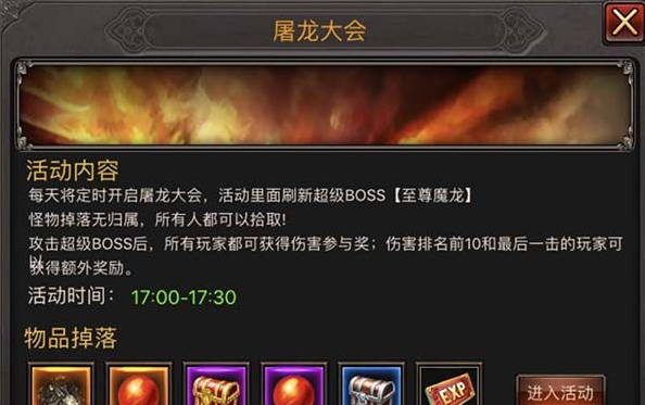 4、玩法:“至尊魔龙”在时限半小时内被击杀,会掉落大量无归属的物品,超时则会消失;排名奖励会通过邮件进行发放。