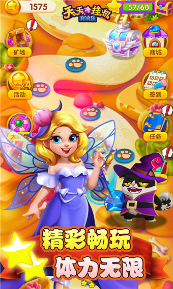 天天挂机消消乐红包版是一款非常有意思的消除类手游。这款游戏和大家印象中的消除手游不太一样,游戏加入了剧情模式,加入了家园建设经营和矿场玩法,游戏背景是坏猫格鲁特占领了精灵矿区和家园,只有通过消除方式才能攻击到坏猫,你能帮助仙女莉莉和小精灵一起打败坏猫吗?游戏玩法大家都不陌生,只要将三个或者以上的相同宝石连接起开即可完成消除,美官都有限定的目标和分数,达到三星才是最棒的。没到三星也不要紧,重新开始或者挑战下一关即可,游戏内的家园系统非常棒,自由建造各种设施,打造你的美丽后宫,解救更多精灵和动物,通过关卡可以获得金币,购买各种强力道具,遇上瓶颈可以适当使用道具。