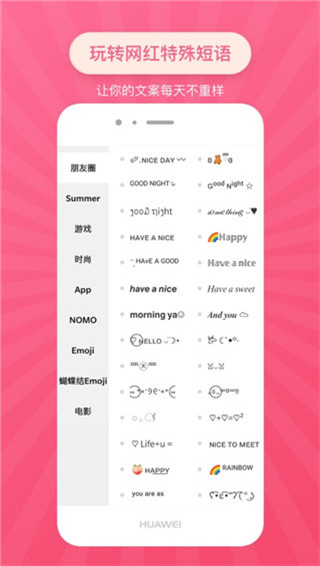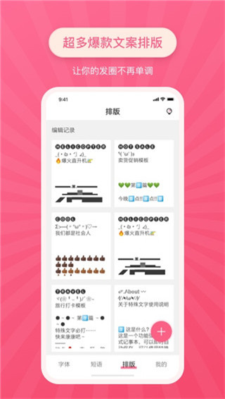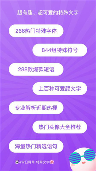 特殊文字安卓版就一款非常好的软件,该软件中有着许多样式的花样字体,以及各种各样的特殊符号与特殊字体,用户可以直接复制到粘贴板,在与其他用户聊天时就能很方便快捷的使用,让文字交流不再无趣,让枯燥的文字变得生动起来。该软件中还蕴含着又各种各样的特殊字符组成的语句,让你在各个节日或是一些常见的场景中任意使用。更有丰富的热门短语以及表情包等都可以一键生成,让你紧跟潮流不掉队。最新推出的头像功能、个性网名功能等特色功能让你变得与众不同,独一无二,这些新功能可以满足广大用户对于社交方面的需求。下载这款特殊文字app让你与他的聊天变得有趣起来。让你在社交平台上变得出类拔萃。