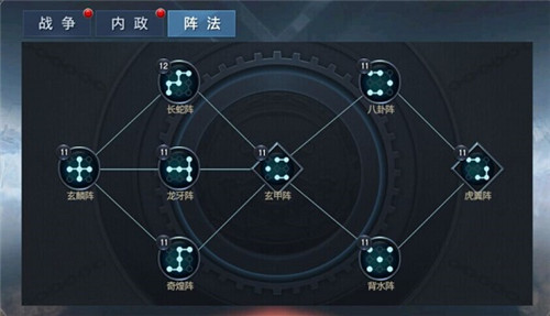 法阵的话适合初期的只有一两个阵,这时随便主点一个就行,主力推荐玄甲阵及战法阵这两个。由于游戏前期只会有战法将上阵,所以建议科技先点防御和兵力及战法伤害这三个。
