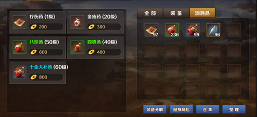 小评:不要一次性购买过多药剂,暂时不需要的道具可先存入仓库,确定不再需要的道具出售节省背包空间。
