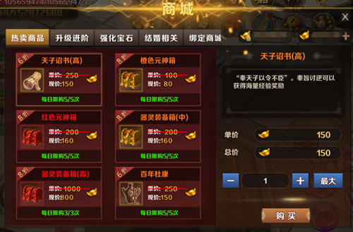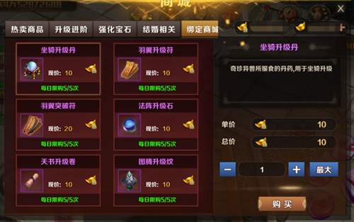 A12、商城中购买的货币为元宝和绑定元宝,热卖商品和绑定商城是有限购次数的。