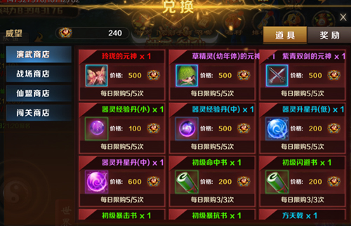 四种兑换商店、四种积分,较完善的道具种类,每日兑换限次。这里是战力提升的一大关键。完成每日的挑战、帮派任务及战场活动即可获取积分兑换海量道具资源。