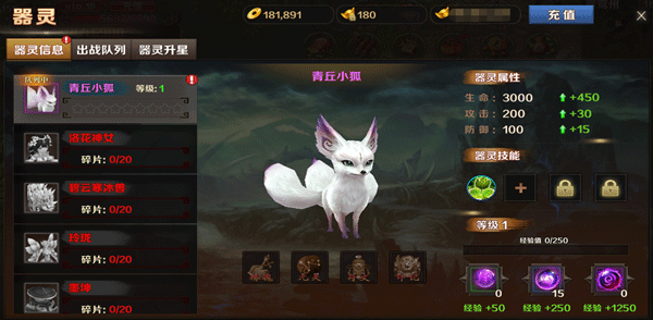 在新手指引中会获得第一个器灵青丘小狐,紫色品质的哦!同时开启器灵功能。在器灵信息我们可以查看包括已激活和未激活的所有仙宠,这样就可以了解器灵的获取方式、资质属性加成和技能信息了。
