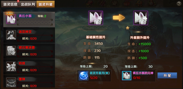 升星之后器灵可以获得额外的等级上限哦,可提升大量的属性