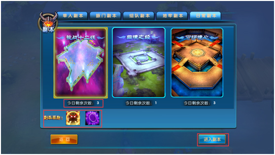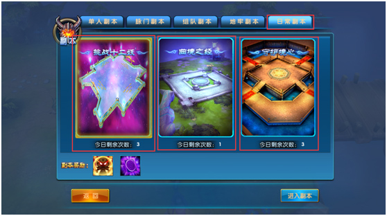 日常副本三张地图,分别为27级挑战十二妖、30级曲境之经、42级守护境心。