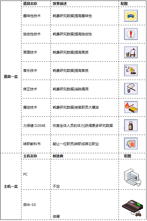 所贩卖的各种技术对开发中的游戏都很有效果。有些道具是消耗品,在使用之后会消失。