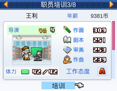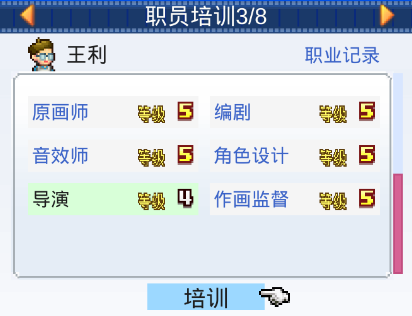 转职完之后,职员的属性会发生一定的变动,例如,从原画师转职成为音效师的时候,就会大幅降低作画和剧本的能力,同时会大幅增加作曲的能力。不断升级不断转职后,你就会发现职员的能力增加了一大截,所以说,让职员们担任不同的职业可是非常重要的培养手段哦!