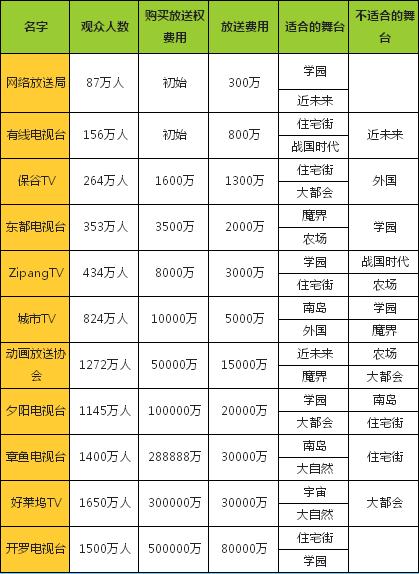 电视台相性一览动画制作物语中的播放平台并不是来者不拒的,为了能让动画作品在合适的播放平台上一炮走红,玩家有必要对播放平台与舞台的相性有所了解。